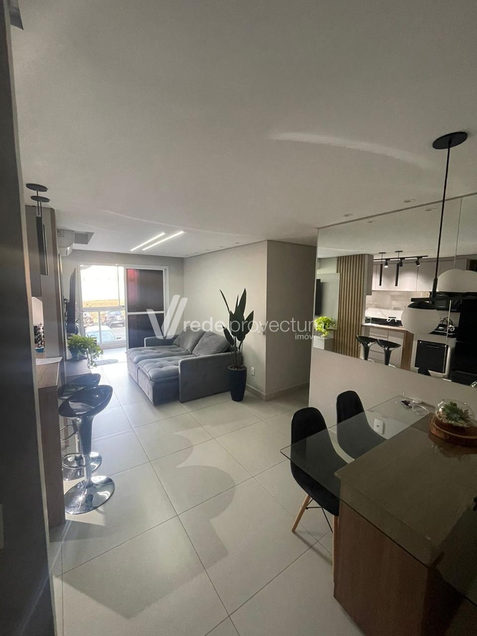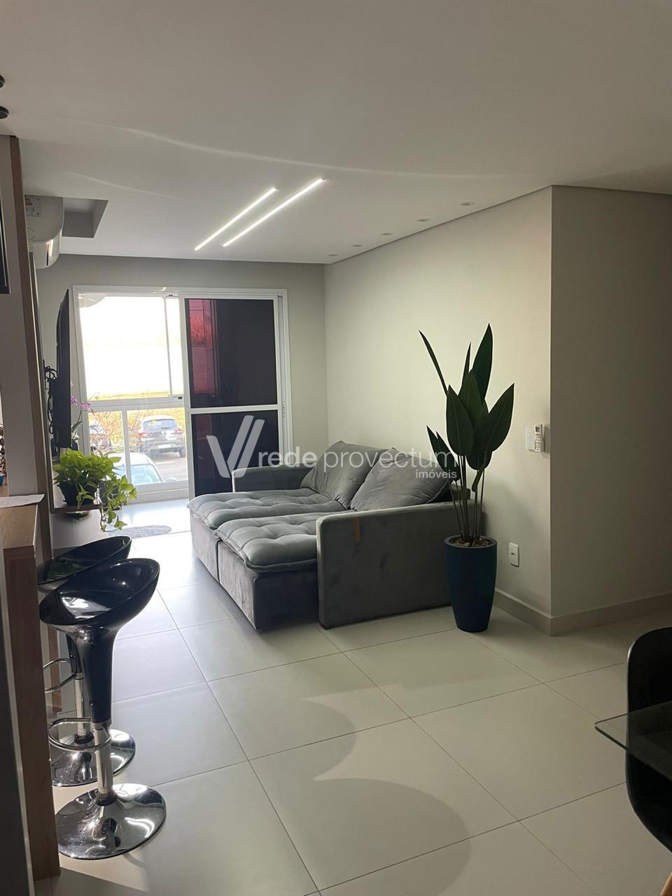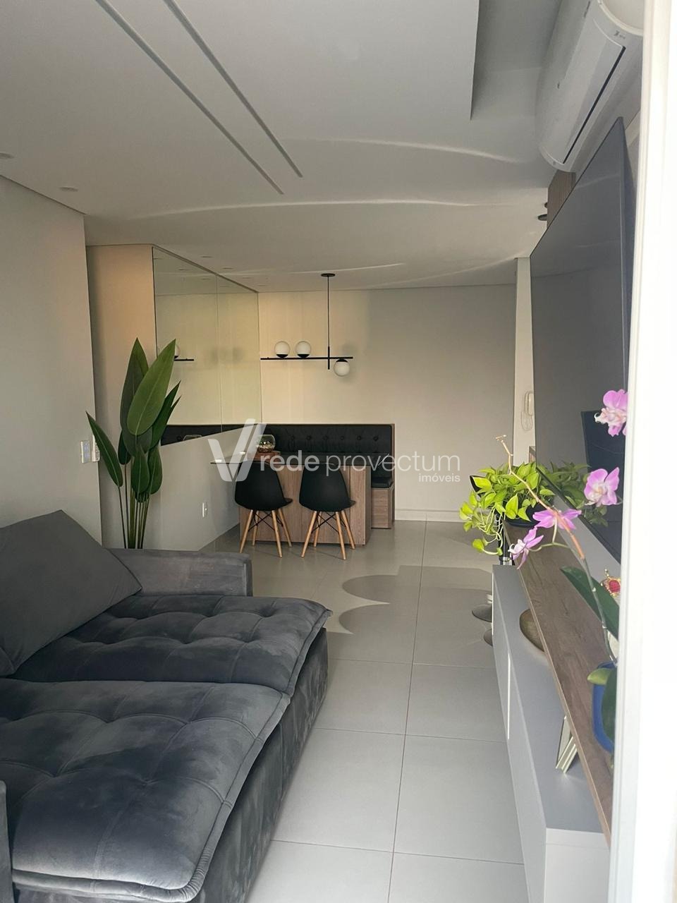 Sala de estar com acabamento moderno e aconchegante;