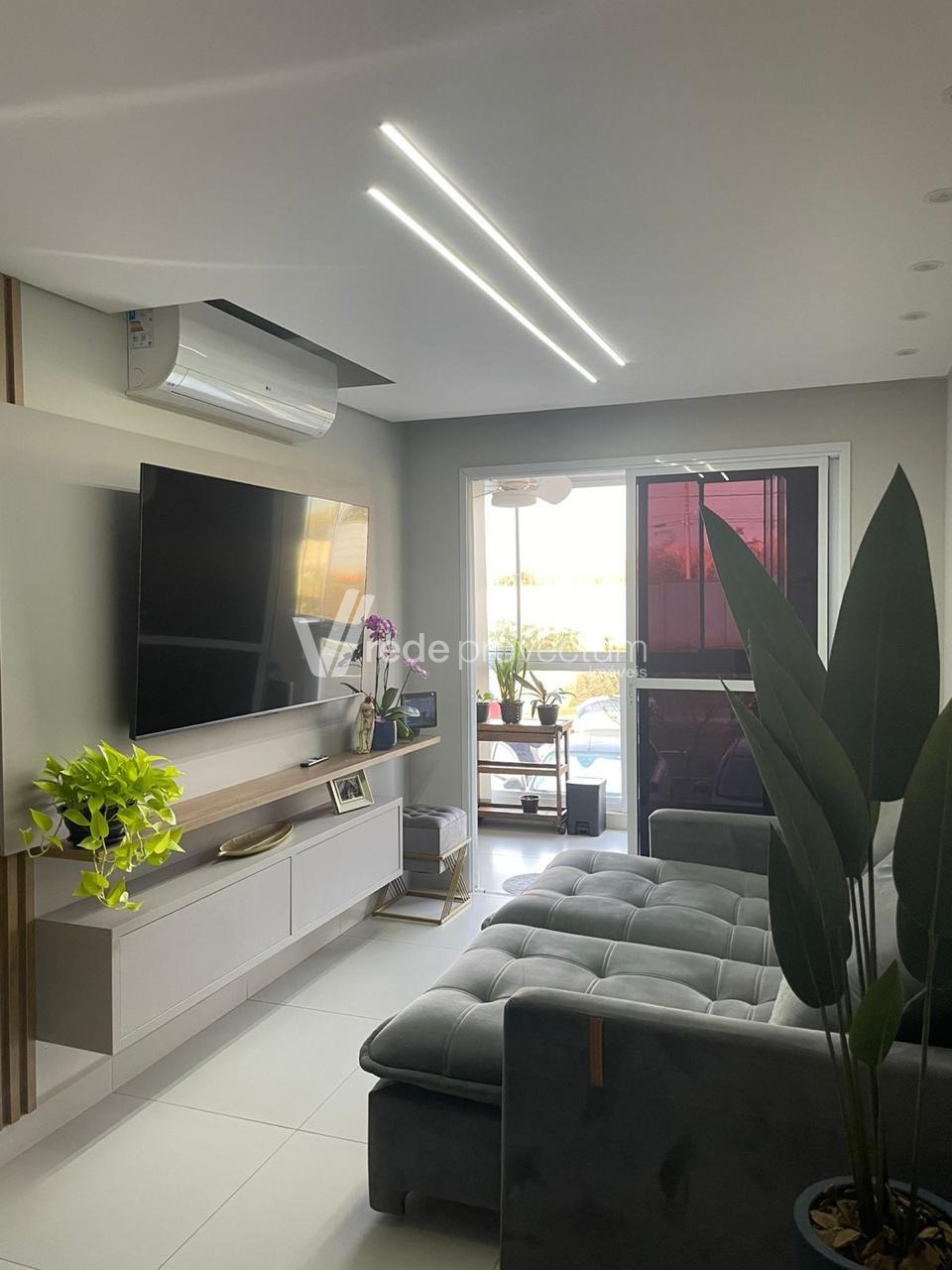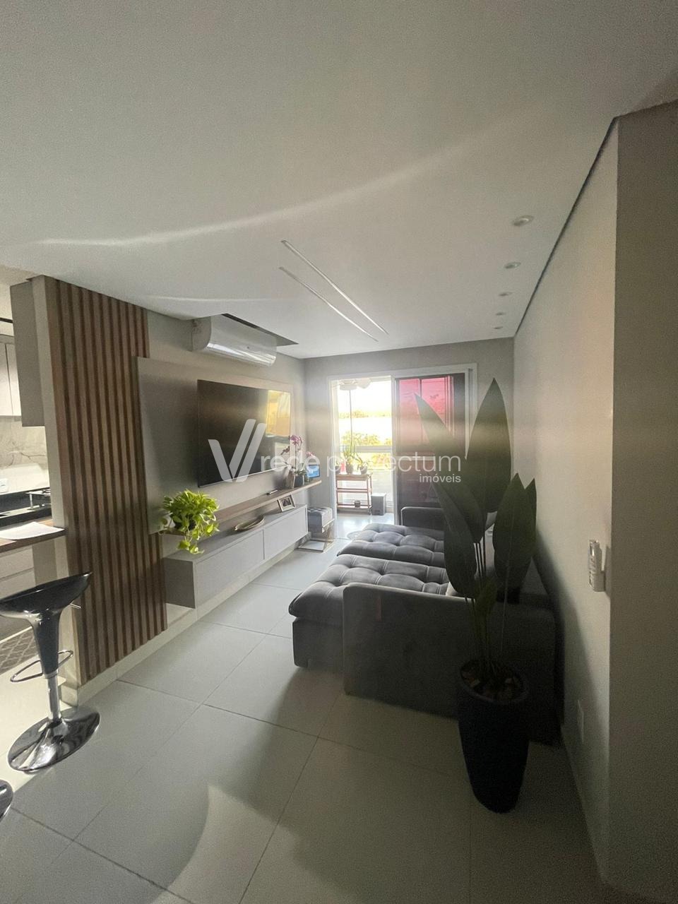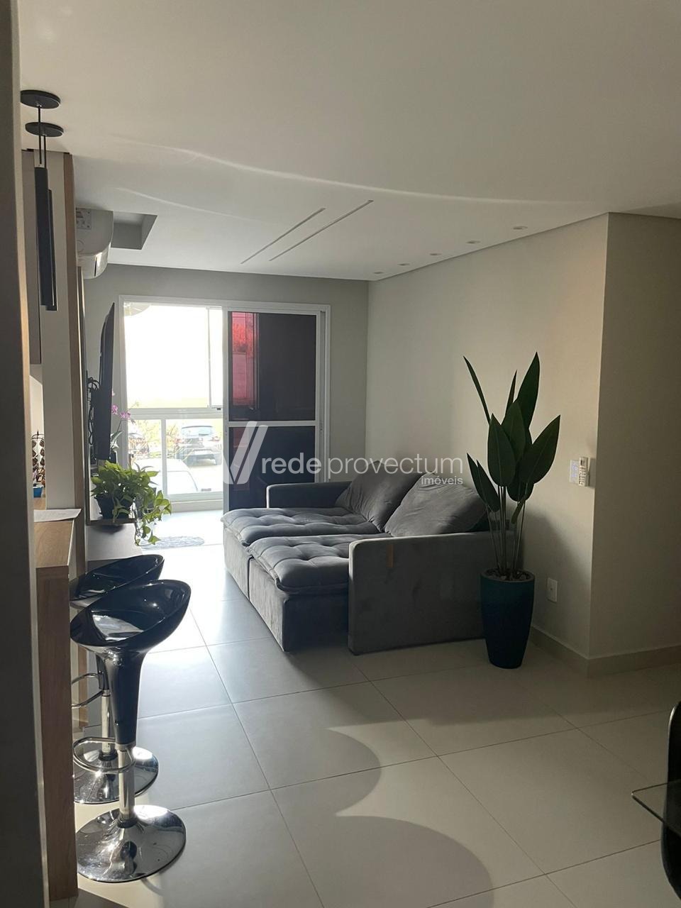 Sala de estar com acabamento moderno e aconchegante;