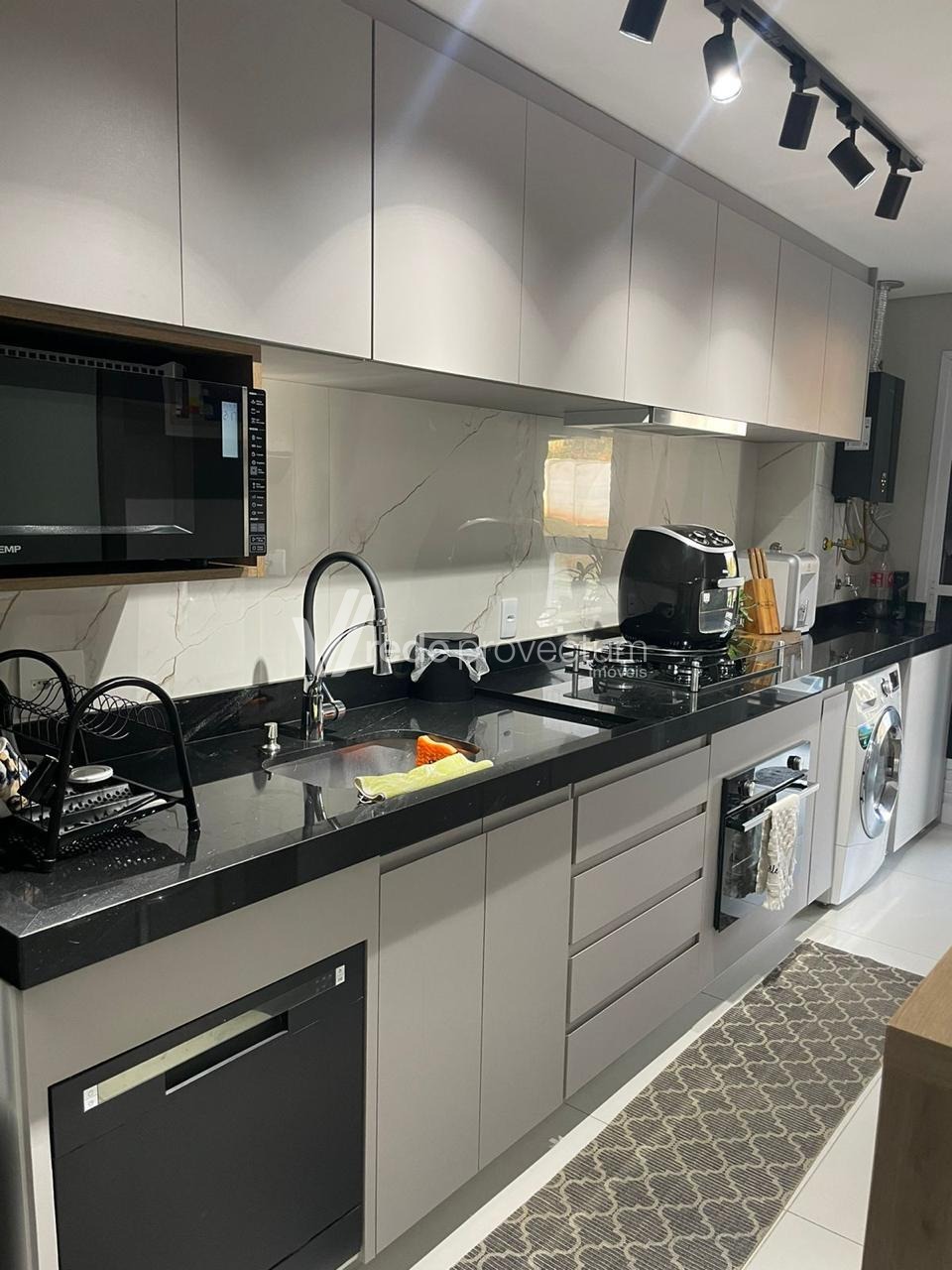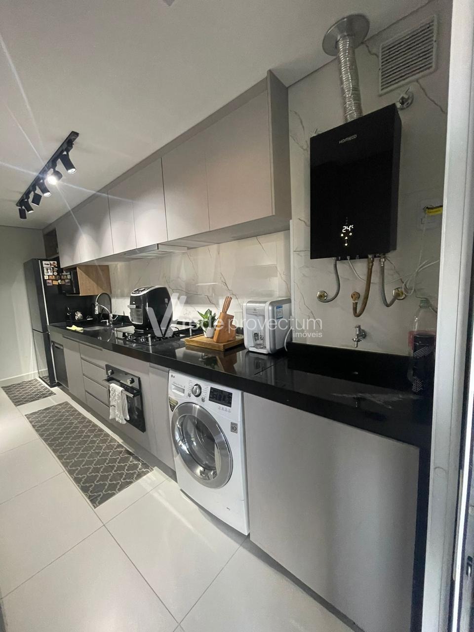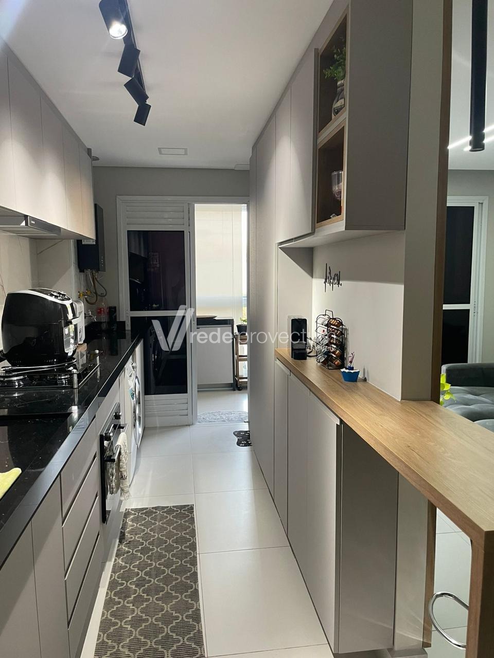 Cozinha planejada, equipada com armários, cooktop, forno elétrico e depurador.
