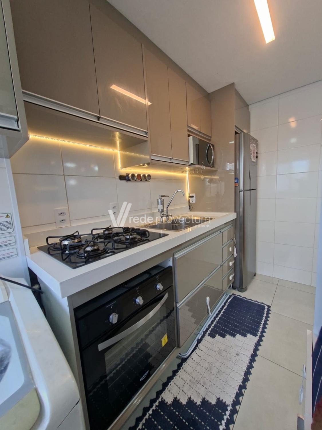 - Cozinha planejada com armários, cooktop e forno;