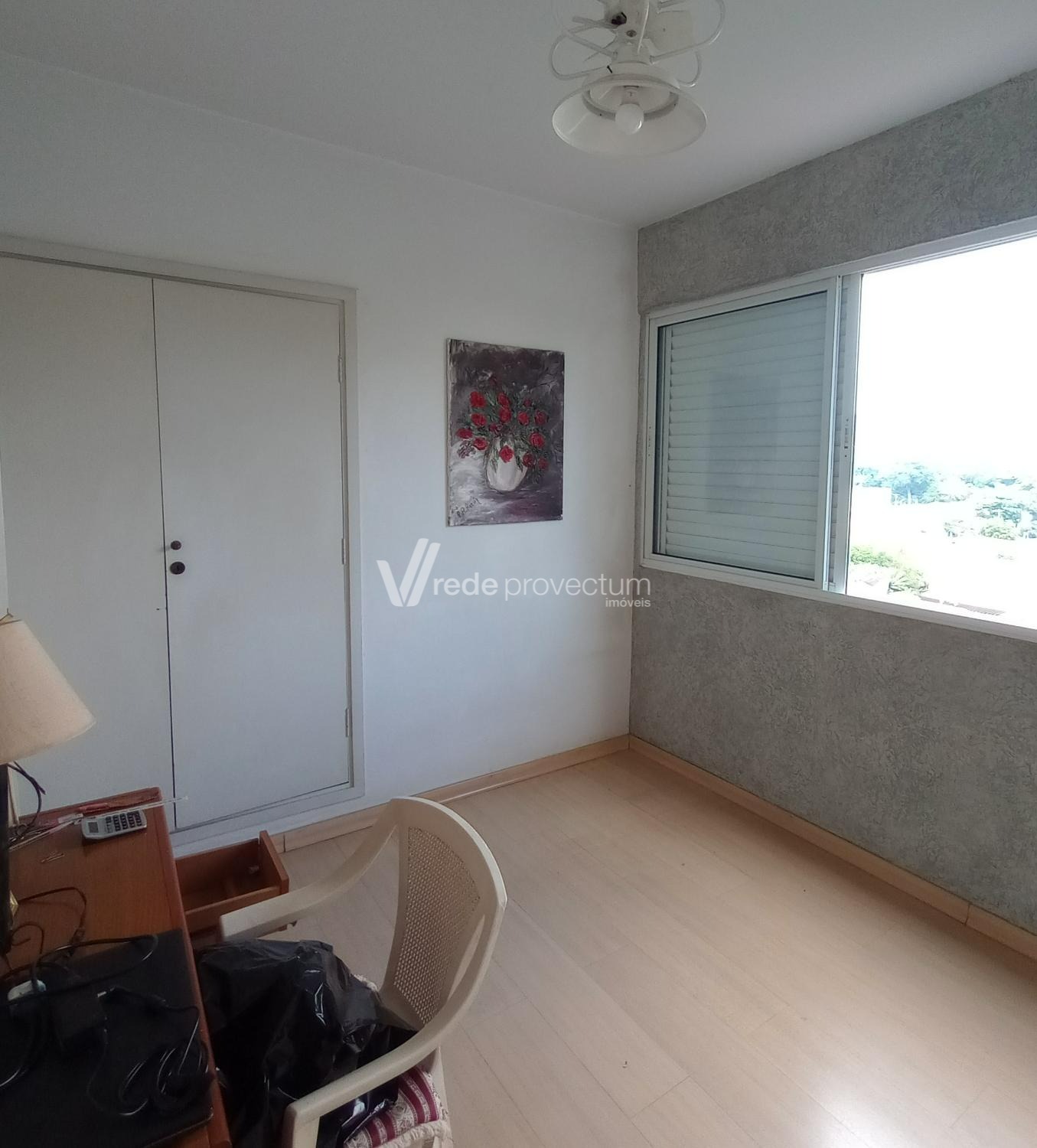 Excelente apartamento no bairro do Botafogo, 1 dormitório que pode ser suíte, sala para 2 ambientes, varanda, cozinha, banheiro, área de serviço e com 1 vaga de garagem coberta livre. Piso de carpete de madeira e rico em armários embutidos.