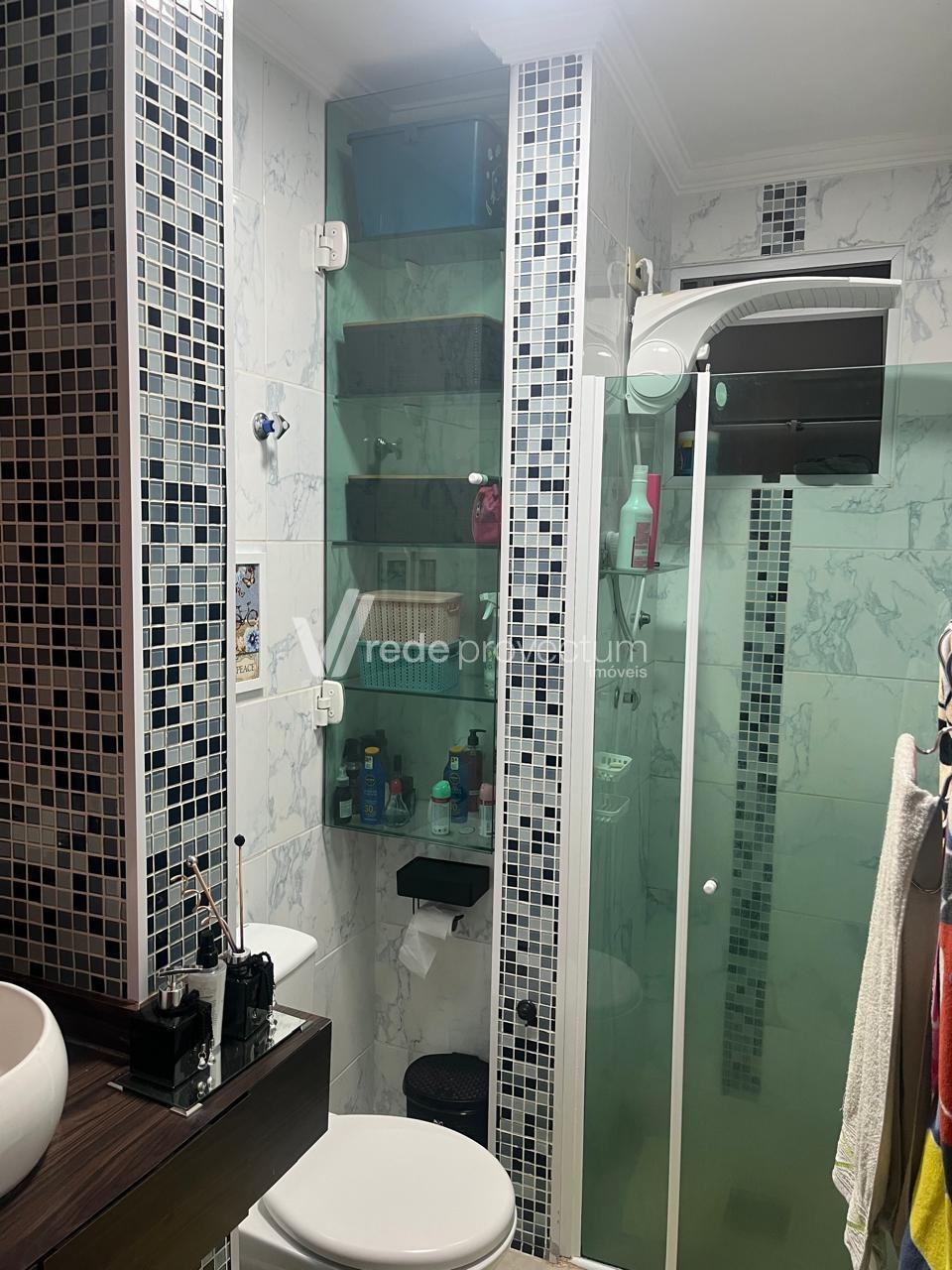 Banheiro moderno, equipado com box de vidro.