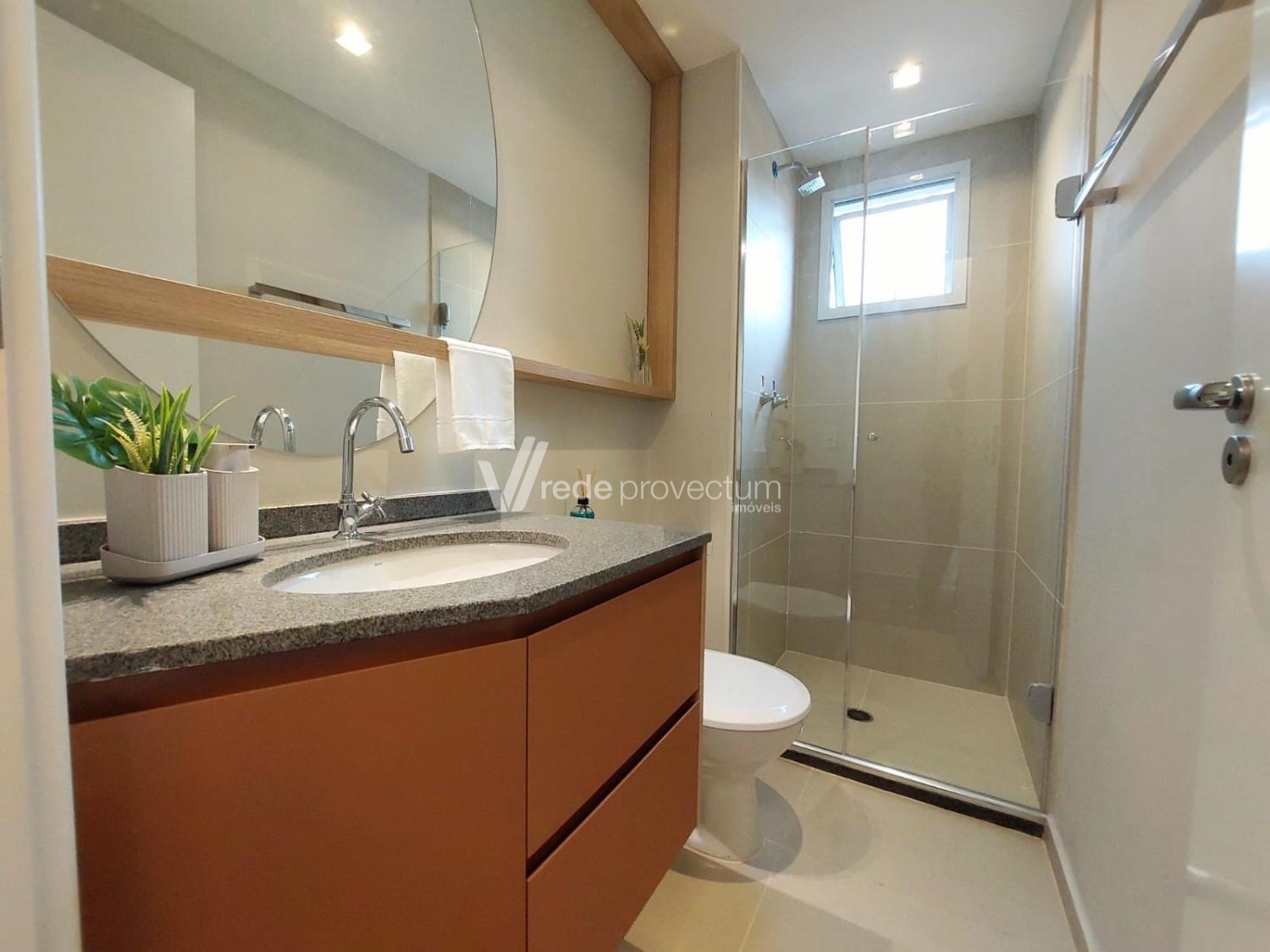 O banheiro impressiona pelo acabamento moderno, com box em vidro, nichos bem pensados e bancada que combina perfeitamente estética e funcionalidade.