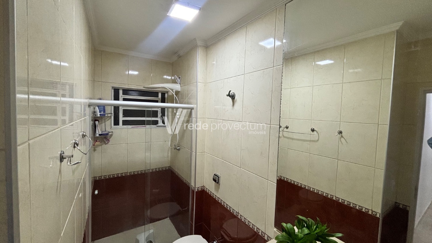 - Banheiro social amplo com box em blindex e janela