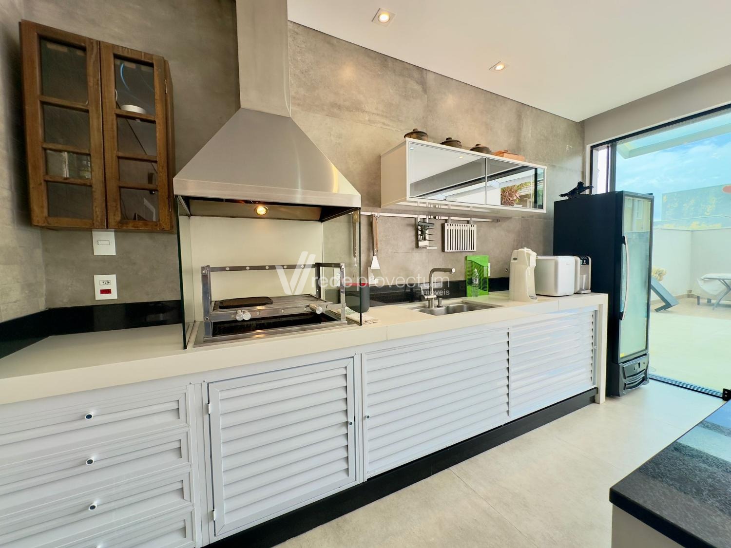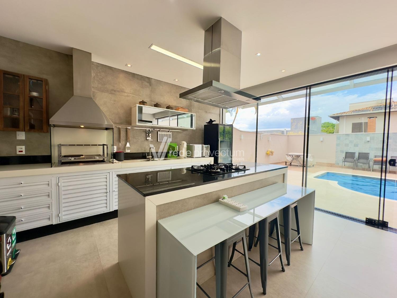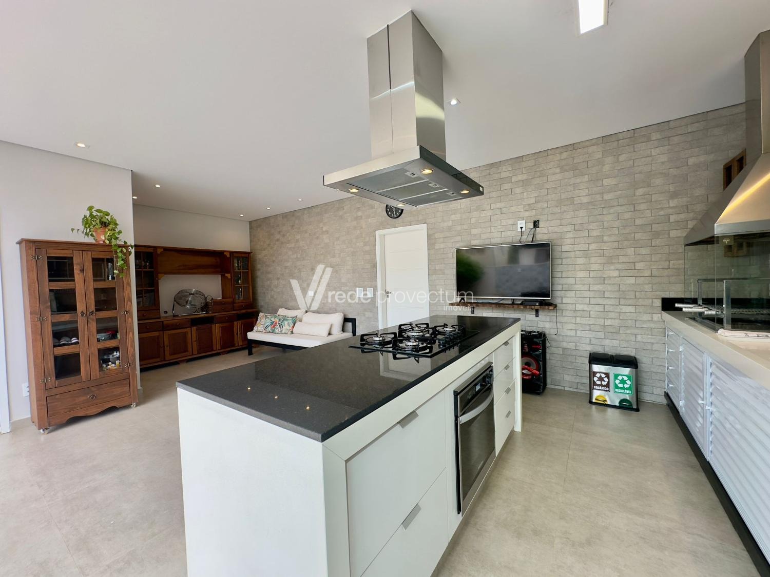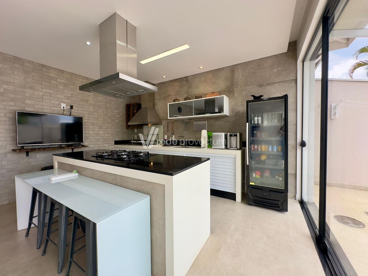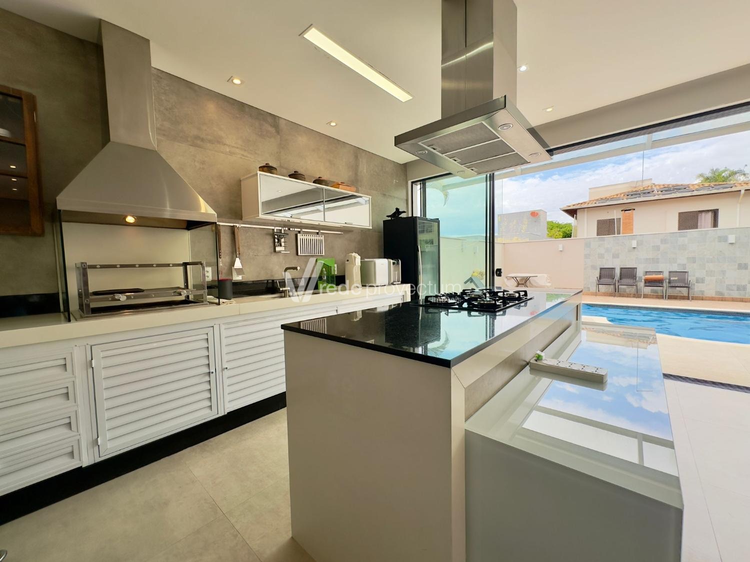 Espaço gourmet completo equipado com churrasqueira com exaustor de fumaça, cooktop, coifa, forno elétrico, repleto de armários Planejados.