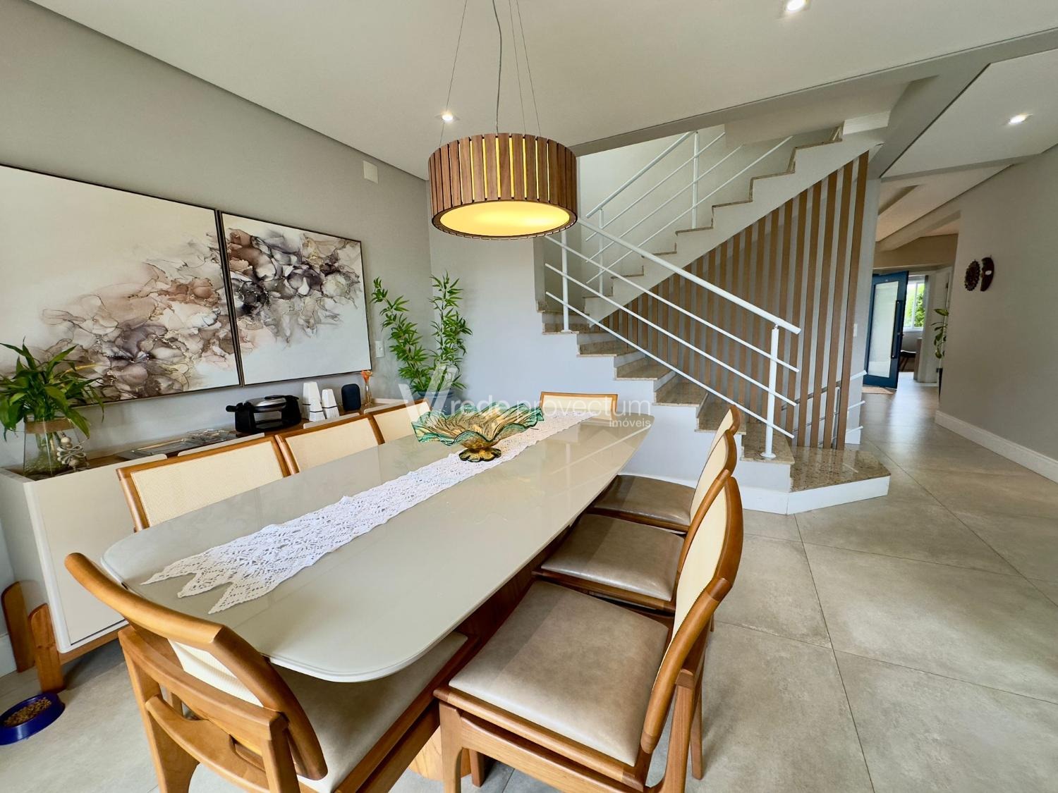 Sala de jantar completa com mesa e aparador.