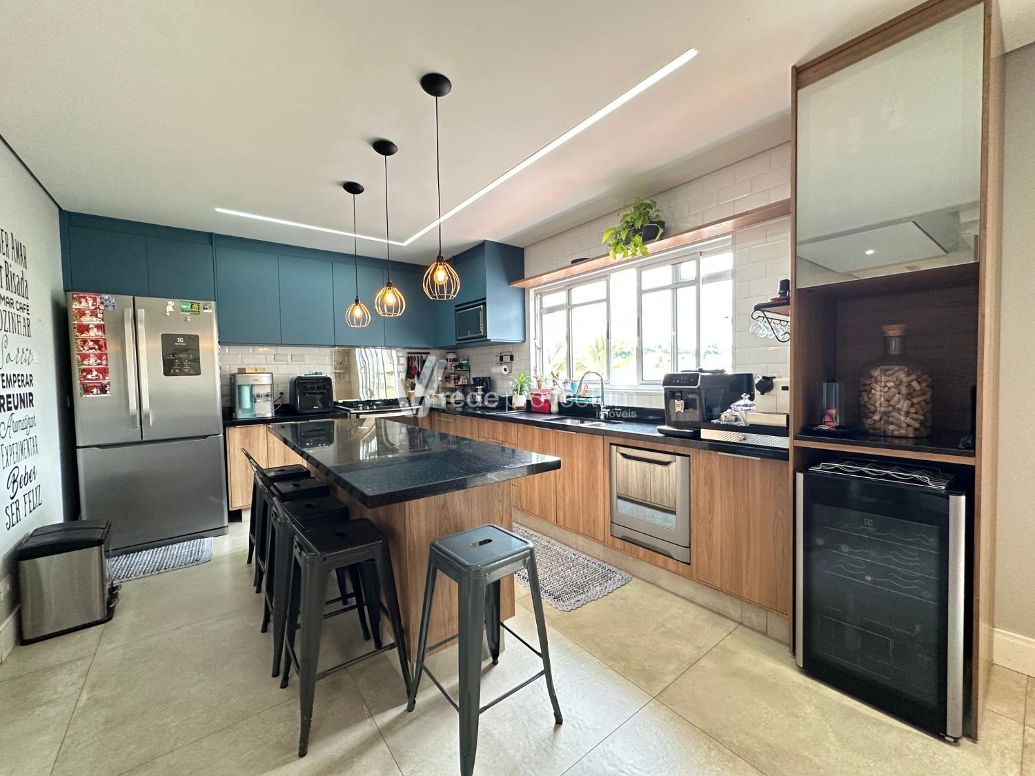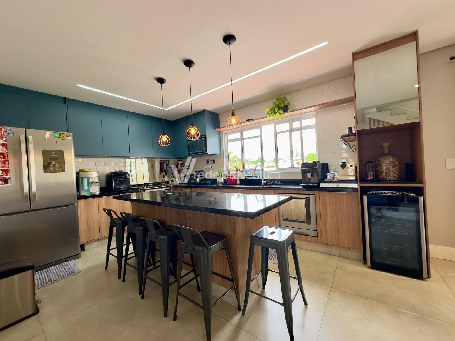Cozinha moderna com bancada e planejados, equipada com geladeira, coifa embutida, fogão, lava louças, adega de vinhos.