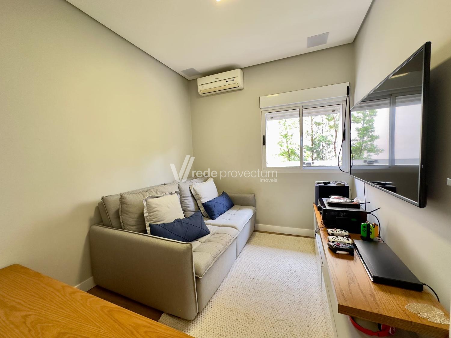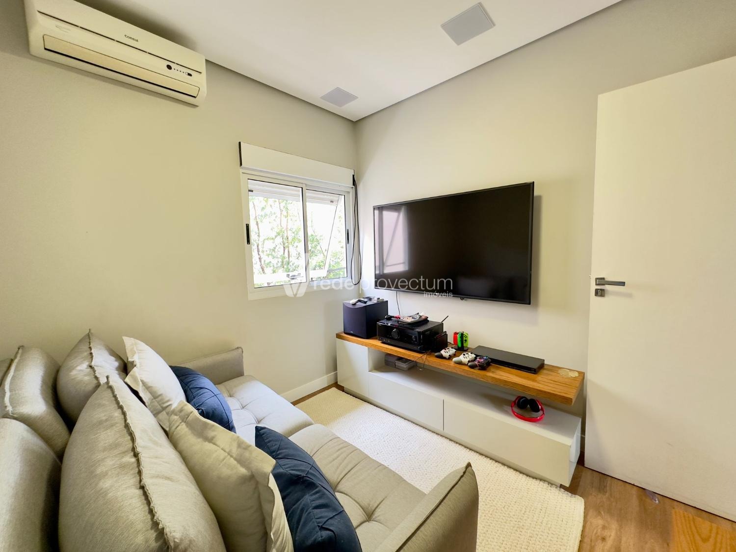 Sala de TV ou quarto de hóspedes completo com sistema de Home theater, Tv, sofá cama e móvel planejado.