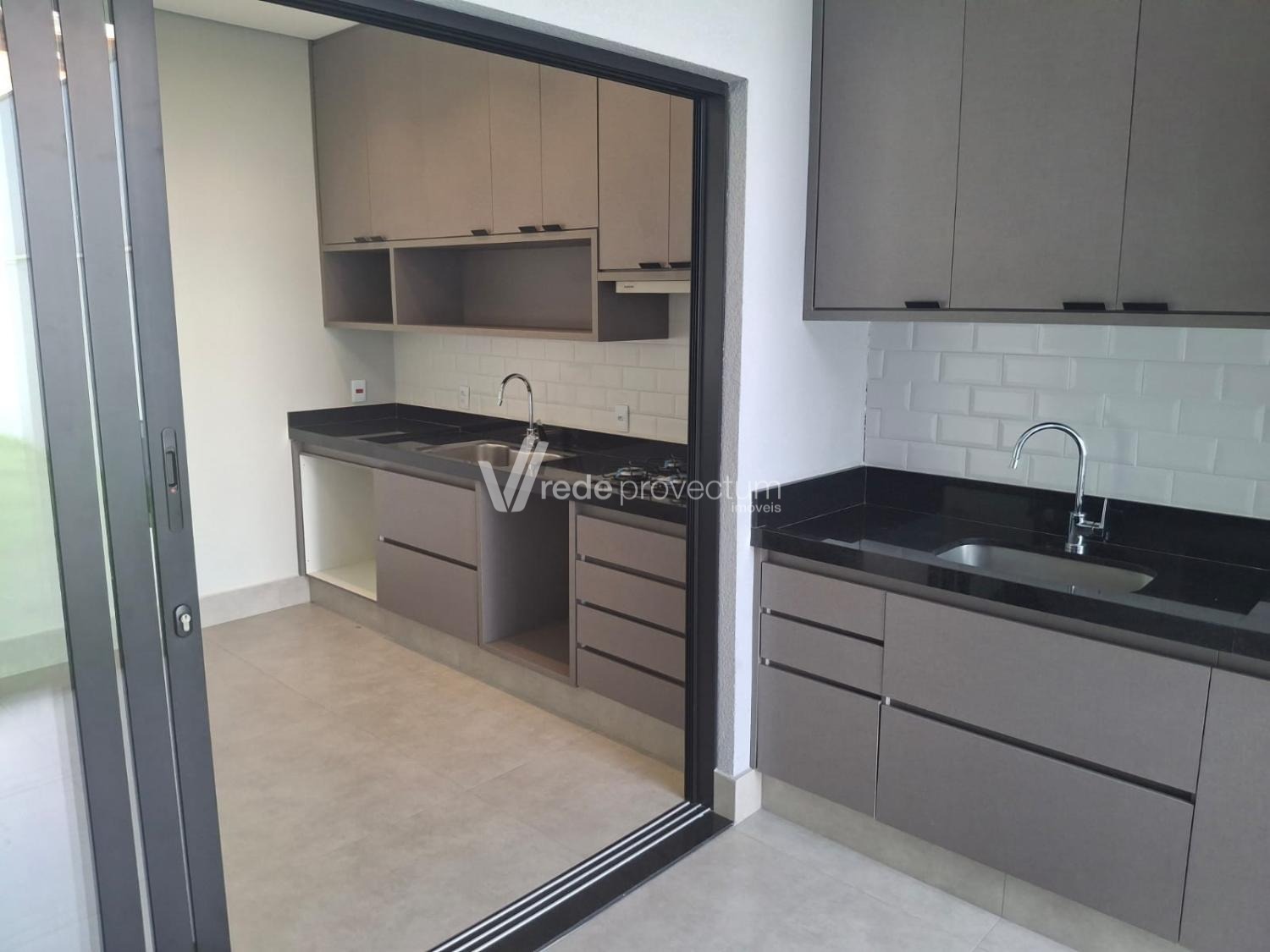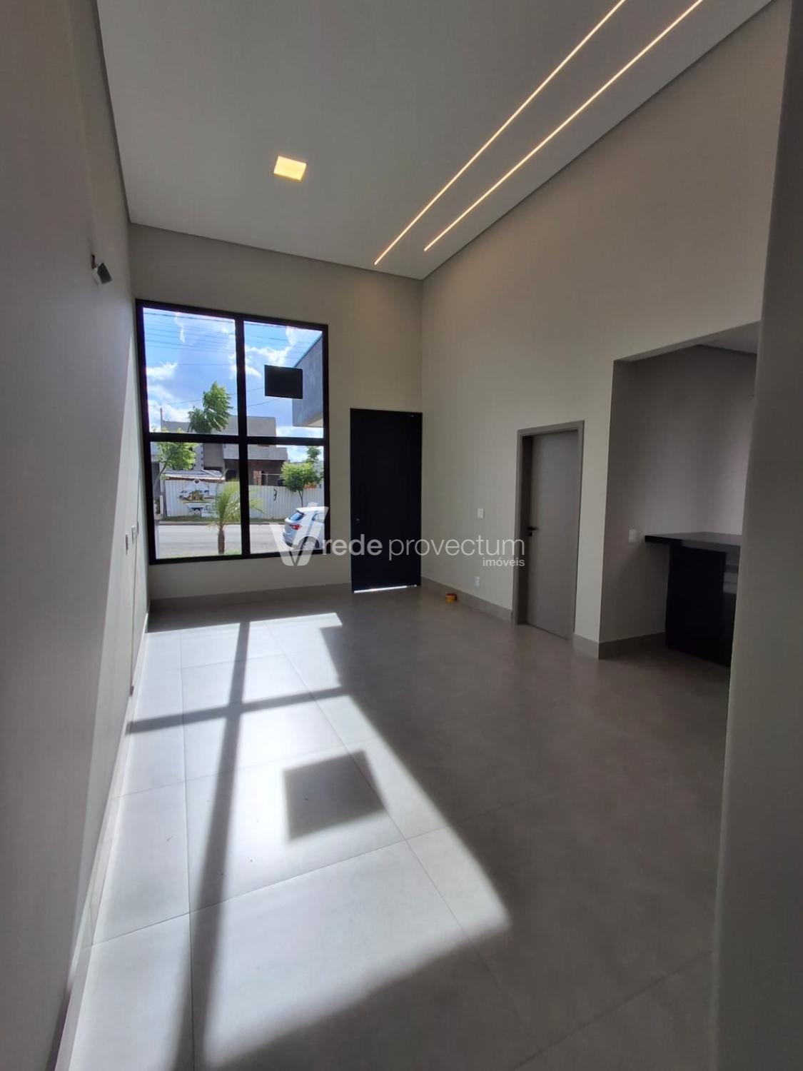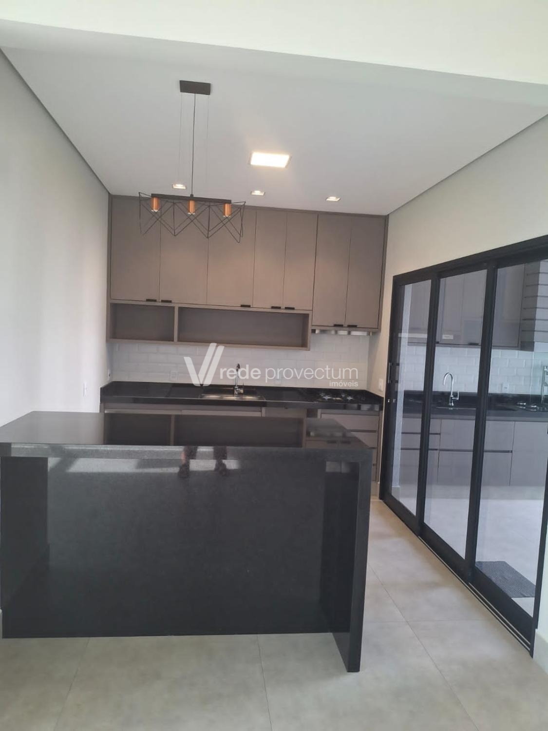 • Sala ampla com pé direito alto, integrando a cozinha e a área gourmet, com ilha e armários planejados.