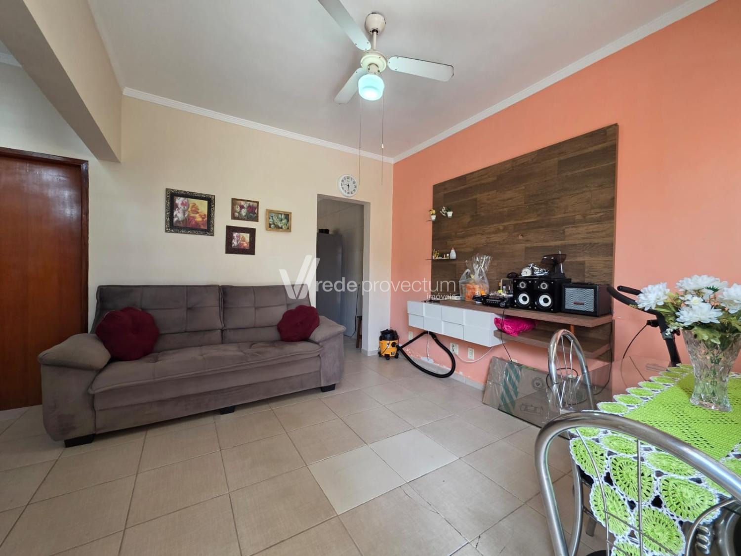 A sala para dois ambientes é equipada com ventilador de teto, cozinha e área de serviço.