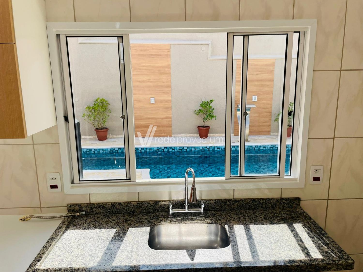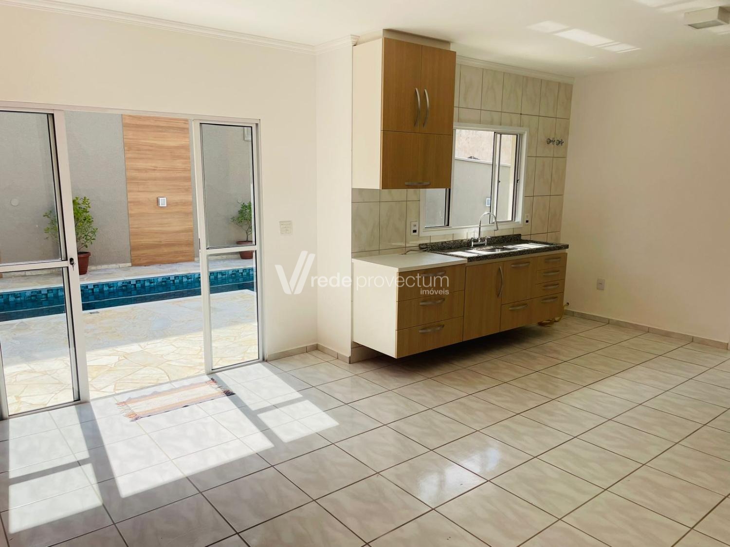 Os ambientes sociais são amplos, bem iluminados e pensados para convivência. A sala se conecta de forma harmoniosa à cozinha e conta com porta de vidro que se abre para área externa, conectando diretamente o interior da casa ao quintal e à piscina. Essa integração traz mais luminosidade, ventilação natural e uma sensação contínua de espaço, além de tornar o ambiente perfeito para receber e aproveitar momentos de lazer. A cozinha foi pensada para o uso diário com conforto. A pia conta com janela voltada para a área externa, trazendo luz natural e vista para a piscina — um detalhe que faz diferença para quem gosta de realizar as tarefas do dia a dia em um ambiente agradável, sem aquela sensação de estar fechado ou de frente para uma parede. A cozinha também possui despensa, garantindo mais praticidade no dia a dia.