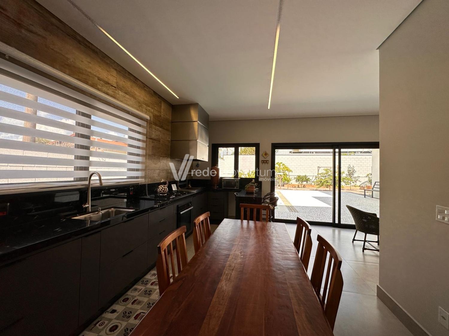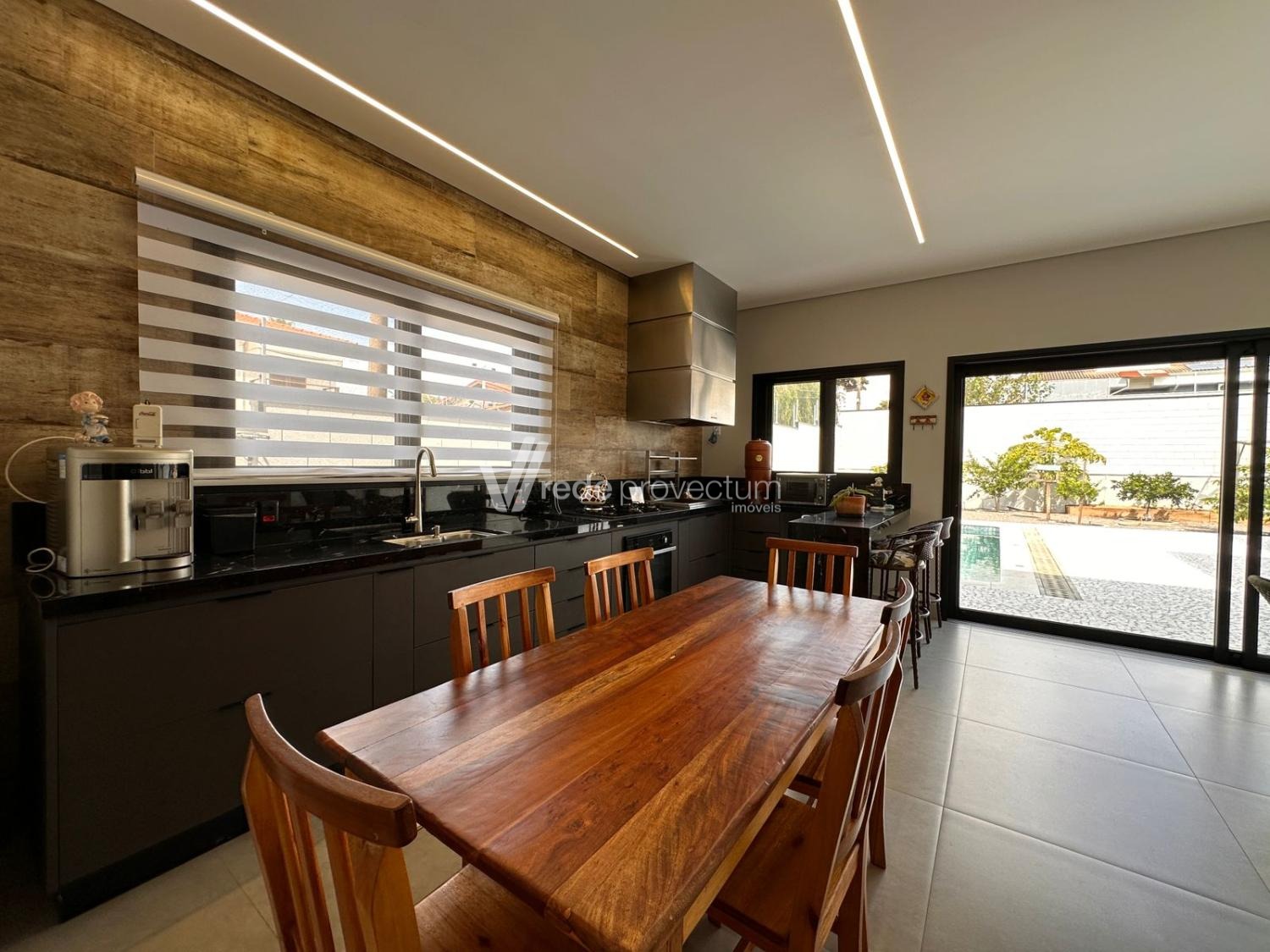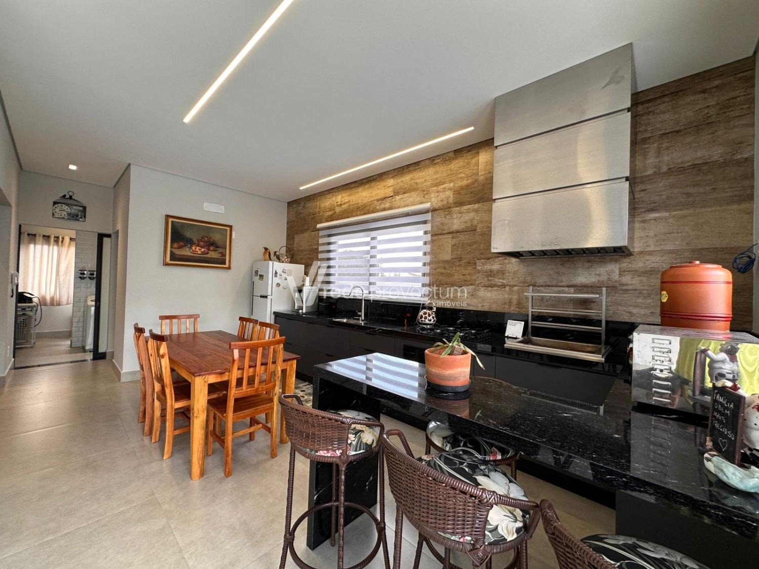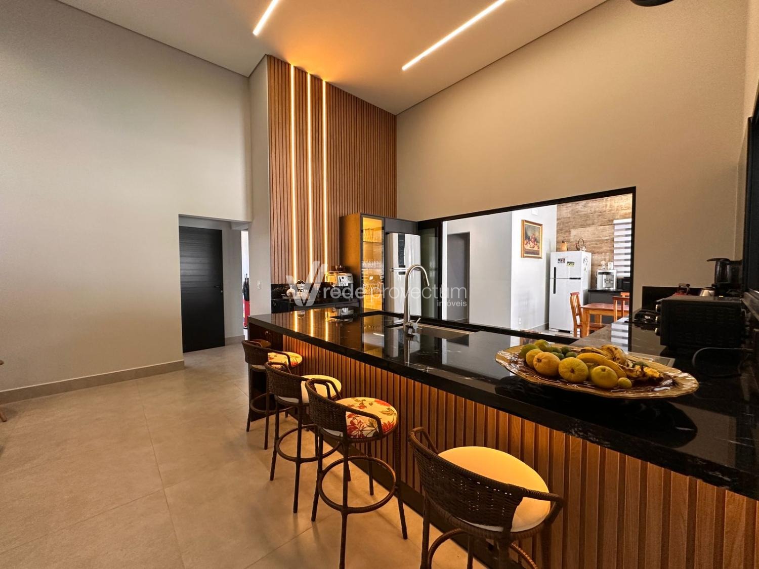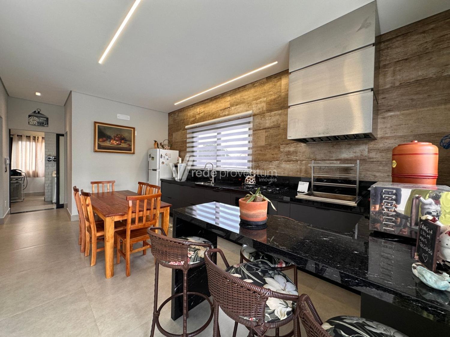 Casa térrea, com 3 suítes amplas, sendo que o quarto do casal possui suíte com closet, todas com persianas automatizadas, lavabo, sala de estar e jantar integrados a cozinha rica em armários planejados, área gourmet com churrasqueira e armários planejados, despensa, lavanderia. Piscina aquecida. Aquecimento solar.