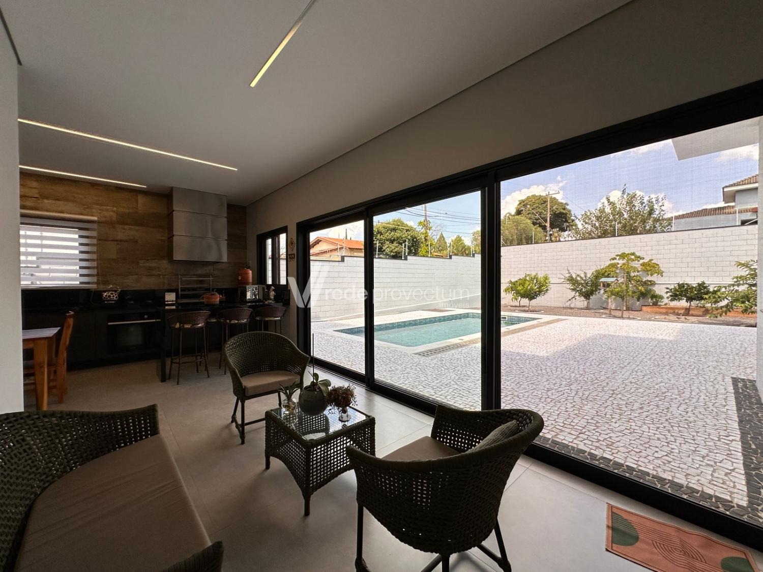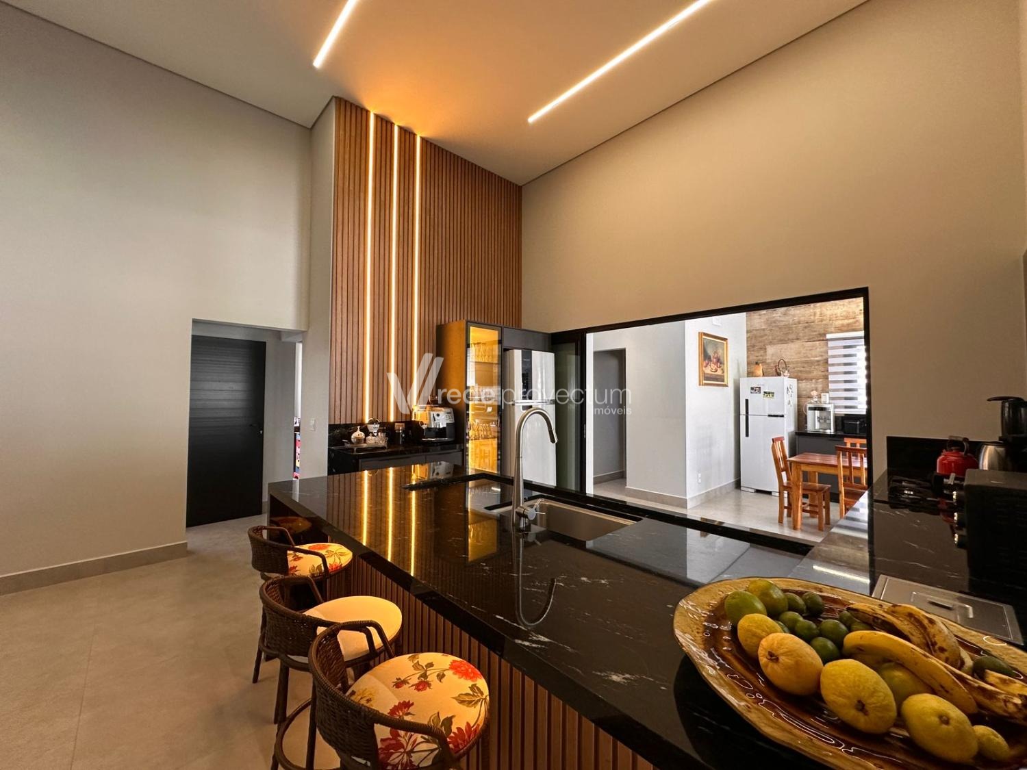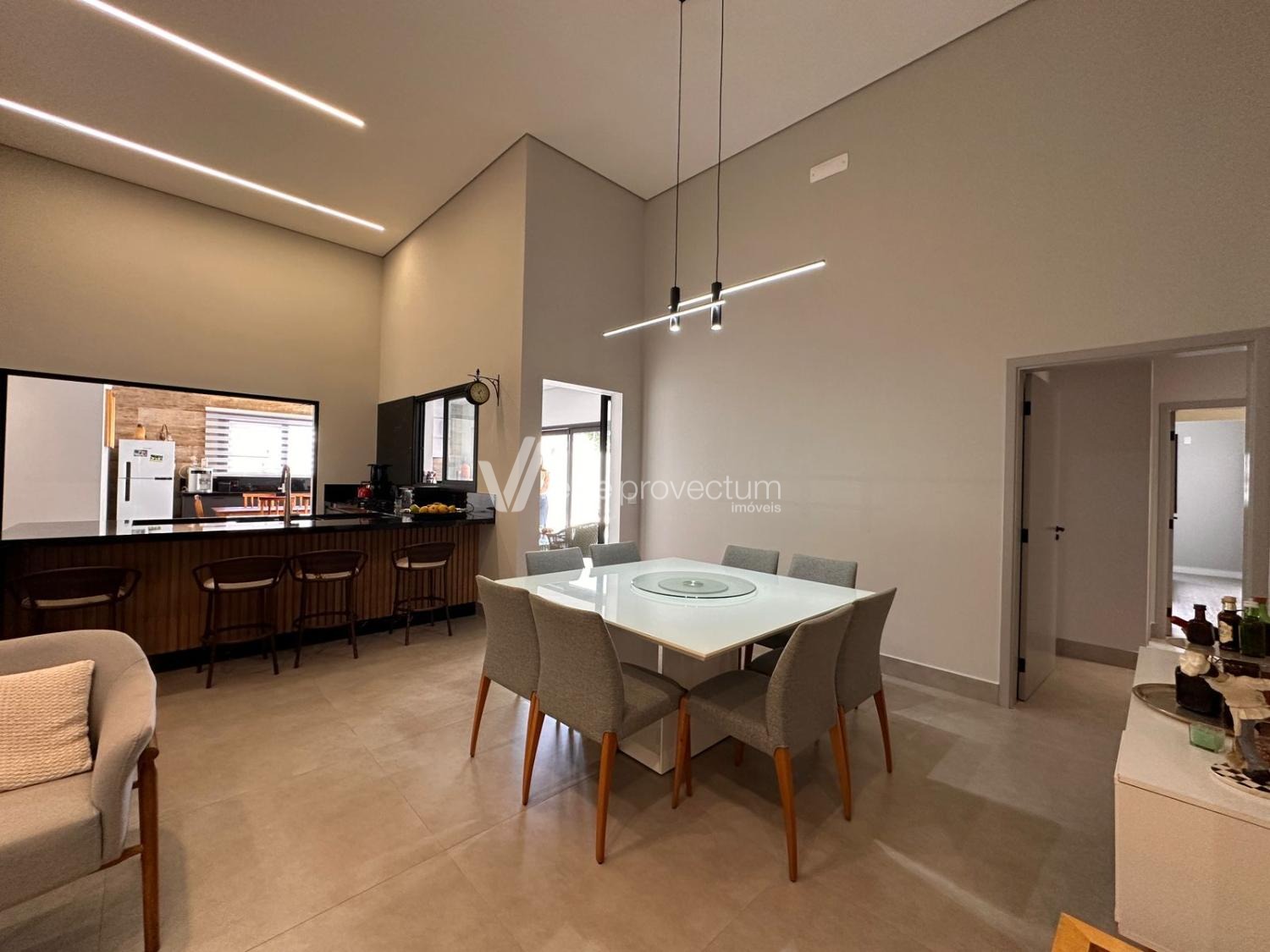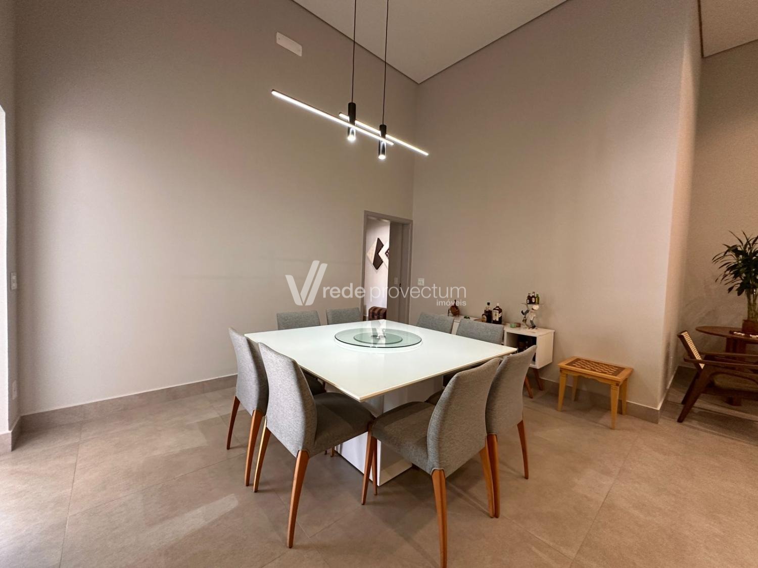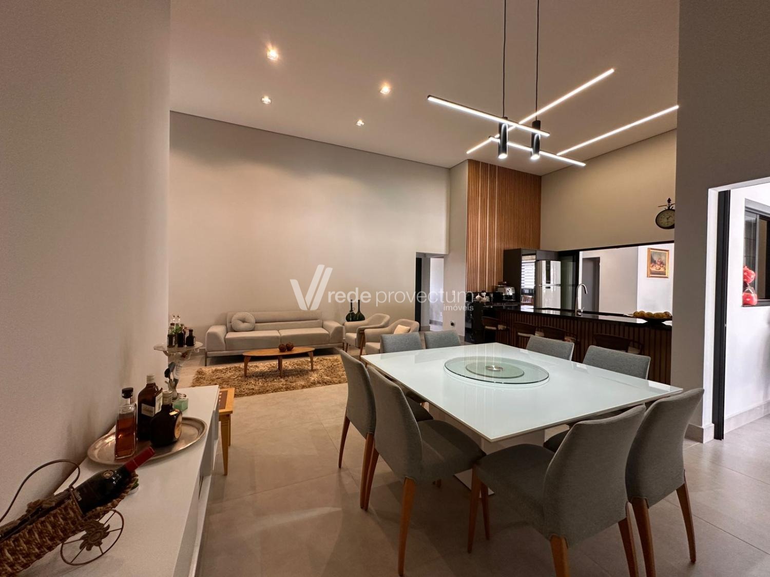 Casa térrea, com 3 suítes amplas, sendo que o quarto do casal possui suíte com closet, todas com persianas automatizadas, lavabo, sala de estar e jantar integrados a cozinha rica em armários planejados, área gourmet com churrasqueira e armários planejados, despensa, lavanderia. Piscina aquecida. Aquecimento solar.