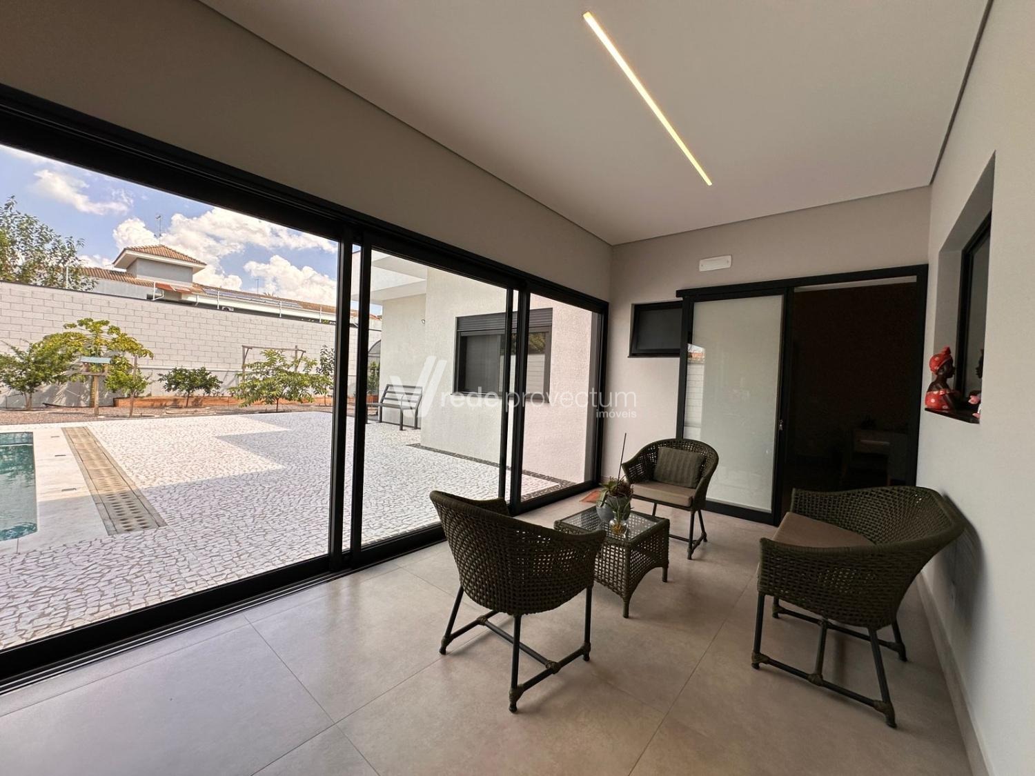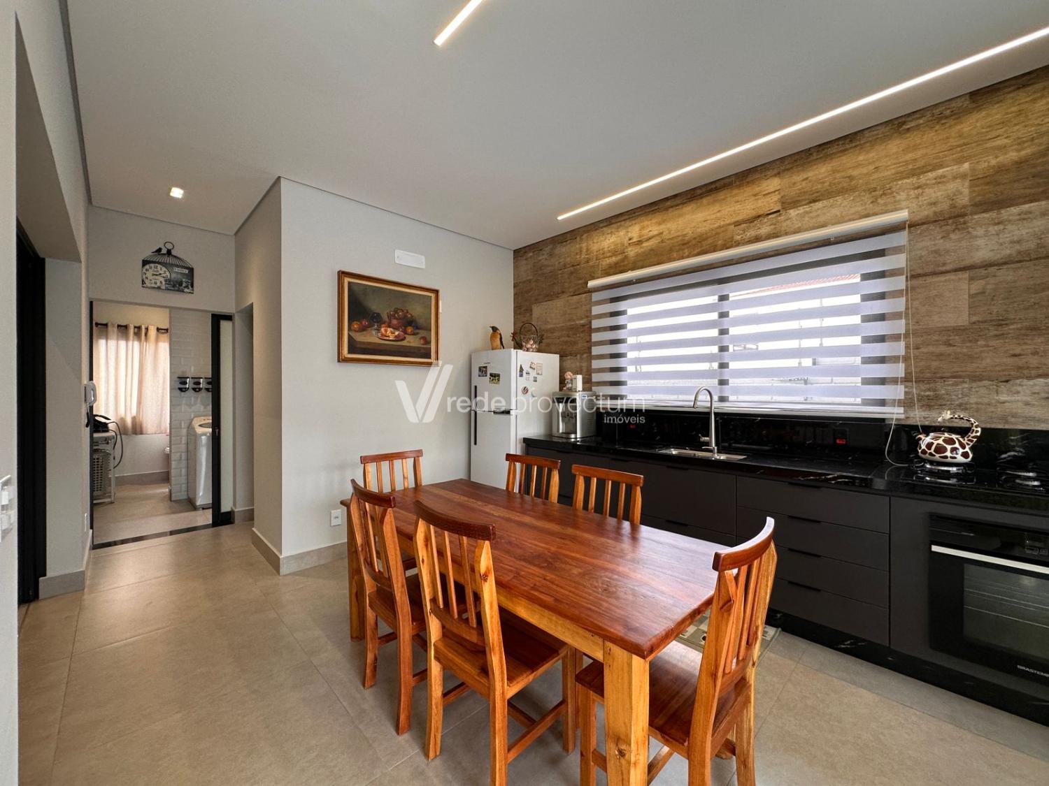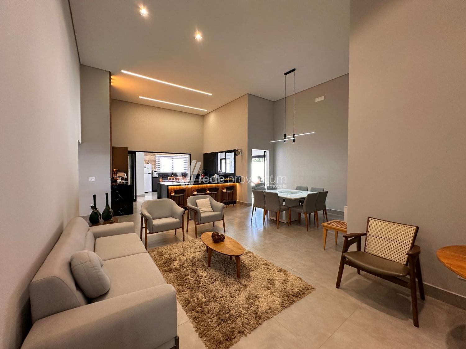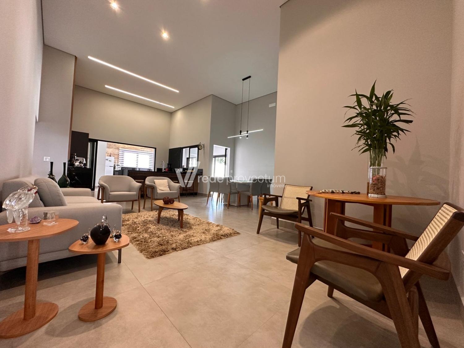 Casa térrea, com 3 suítes amplas, sendo que o quarto do casal possui suíte com closet, todas com persianas automatizadas, lavabo, sala de estar e jantar integrados a cozinha rica em armários planejados, área gourmet com churrasqueira e armários planejados, despensa, lavanderia. Piscina aquecida. Aquecimento solar.