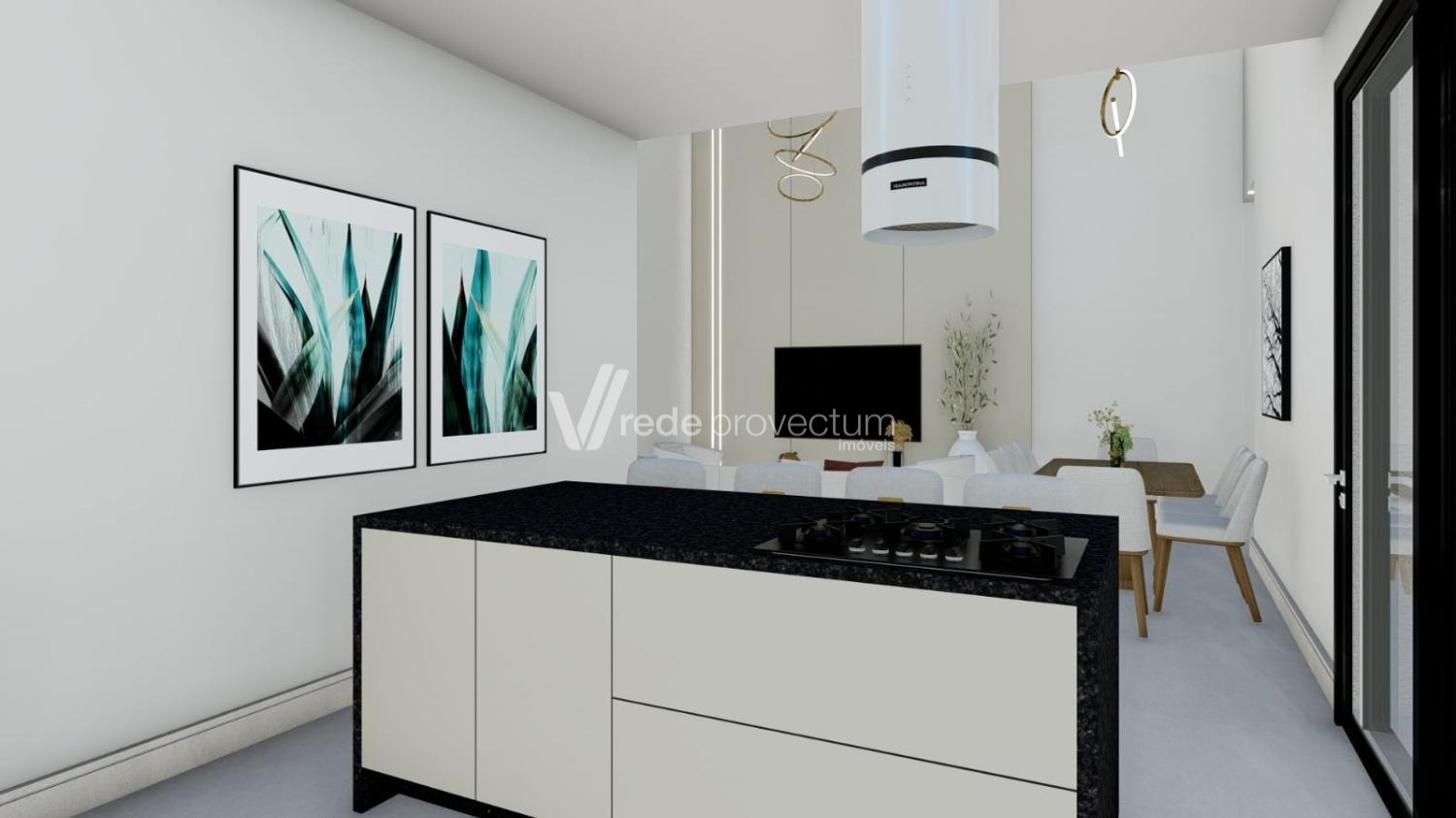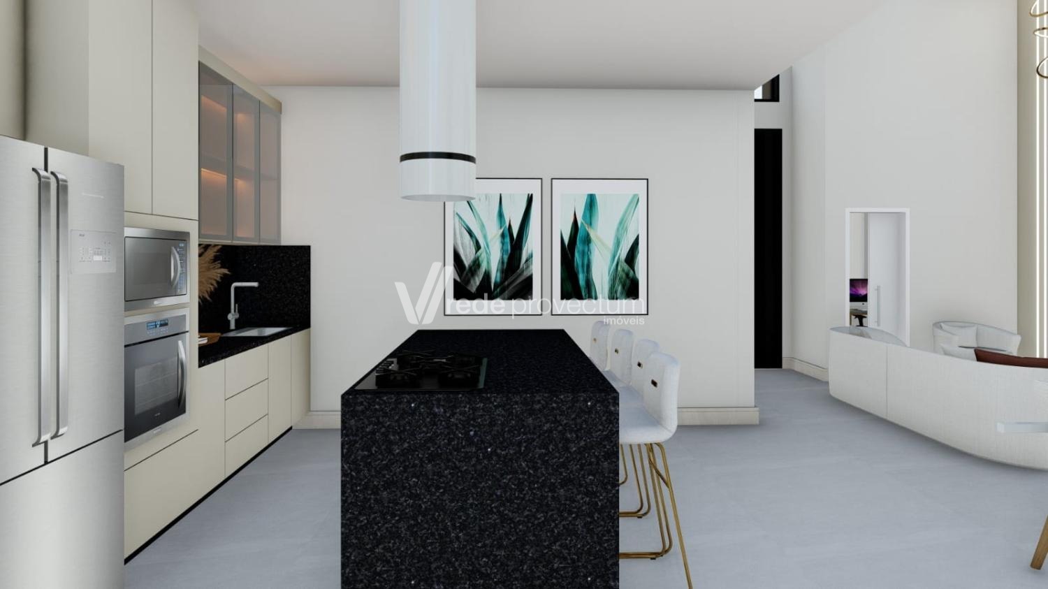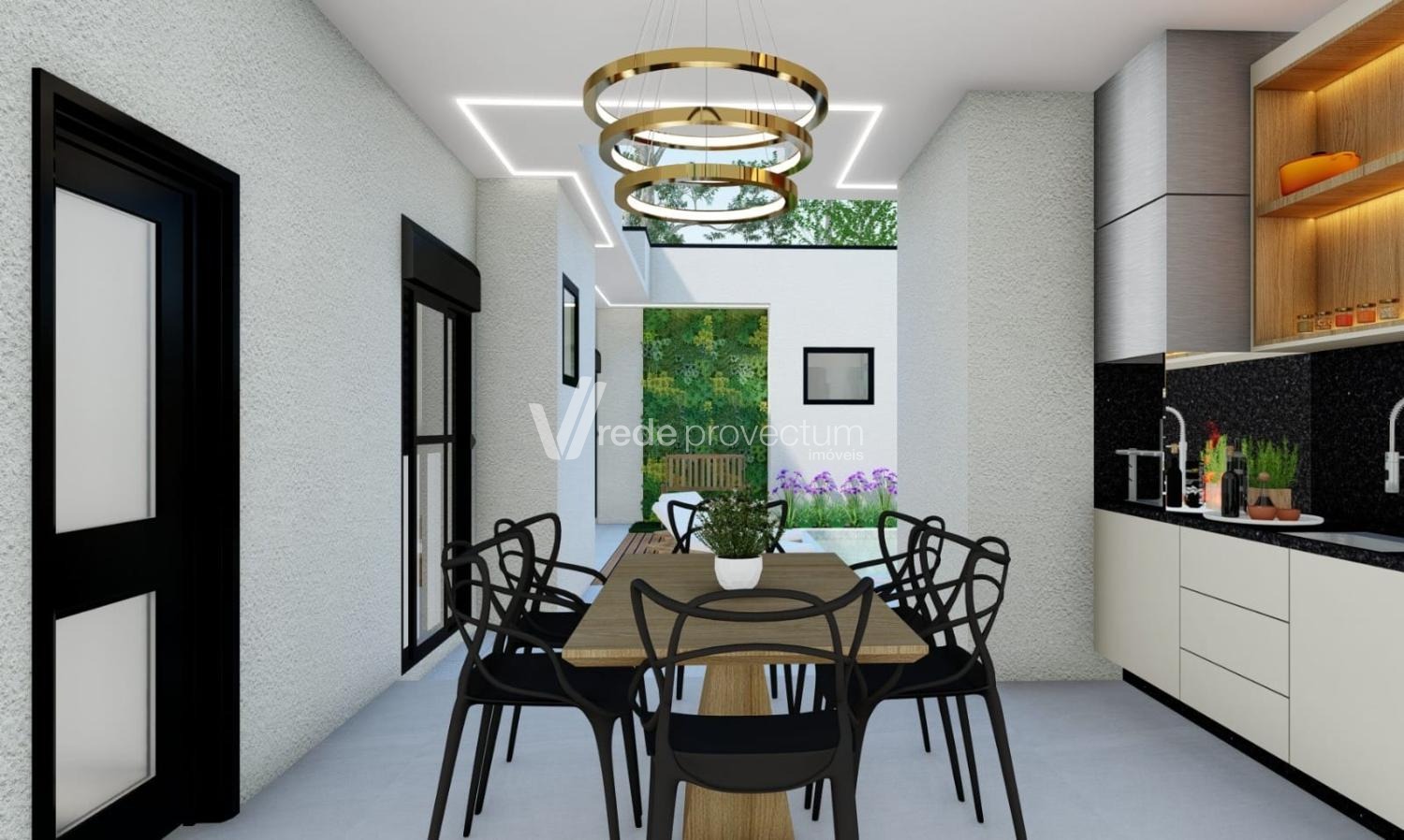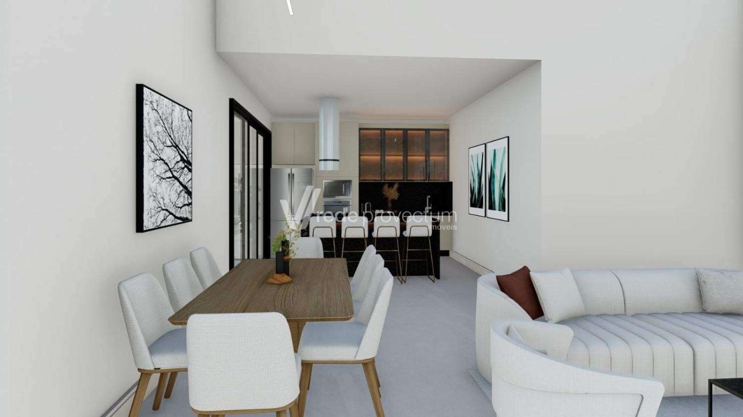 São 169 m² de área construída, distribuídos em ambientes amplos e bem planejados. A casa conta com sala para dois ambientes com pé-direito duplo, cozinha integrada com ilha central e já equipada com cooktop, coifa, forno e micro-ondas.