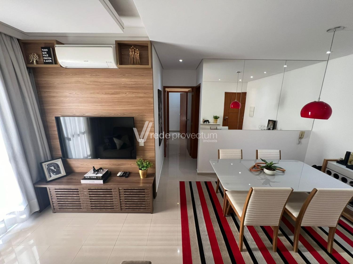 Sala estendida com ar condicionado, persiana, painel de TV, varanda gourmet, 2 dormitórios com armários e ventilador de teto, sendo...